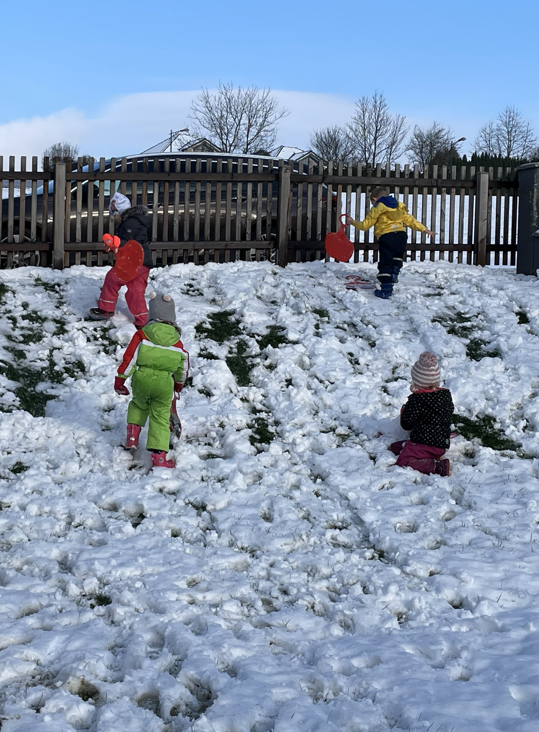 Neben den klassischen Spielbereichen mit Sandkiste, Schaukel und Rutsche haben wir auch eine „Baustelle“, wo die Kinder mit Schaufeln nach Herzenslust in der Erde graben dürfen. Unsere Hanglage ist nicht nur im Winter ein Rutschvergnügen!