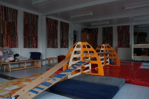 Unseren großen Bewegungsraum können wir täglich nach Belieben benützen. Die Kinder können den Raum auch außerhalb einer geführten Turnstunde nach eigenen Wünschen bespielen.